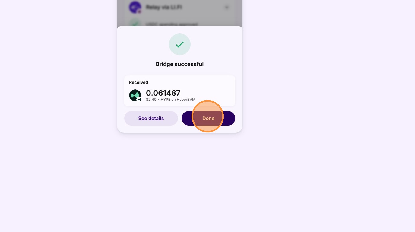 10. Once the bridge is completed you'll get a message to say "bridge successful" and you can hit done. You can then go and double check in your Rabby wallet that you can now see that you have $HYPE token.